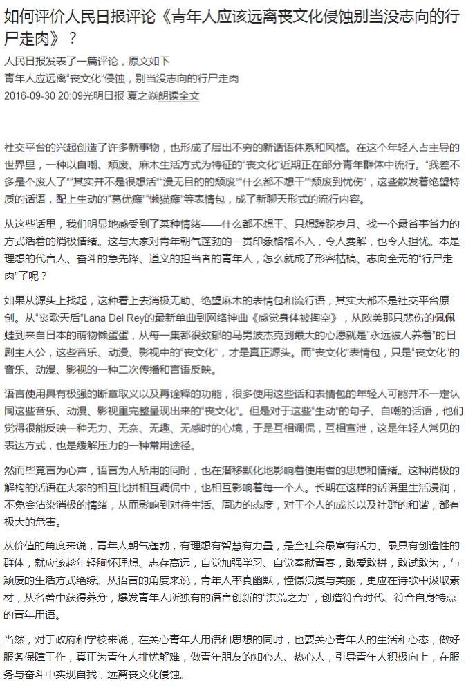 对此,《人民日报》发表评论文章《青年人应该远离丧文化侵蚀别当没志向的行尸走肉》。