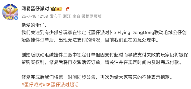 7月18日午间,网易《蛋仔派对》发文致歉称,关注到有少部分玩家在锁定《蛋仔派对》x Flying DongDong联动毛绒公仔创始版挂件订单后,出现无法支付的情况,目前我们正在紧急处理中。创始版联动毛绒挂件二贩中锁定订单但因支付超时而导致支付失败的玩家仍将被保留购买权利,修复后将再次激活该订单,请关注并在规定时间内及时完成付款。