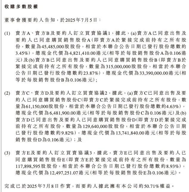 同时这笔交易也导致要约人触发强制性全面收购要约义务,要约价为每股现金0.38港元,预计涉资约8574万港元。