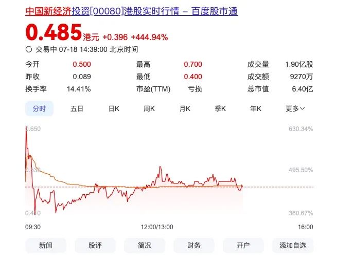 公告披露次日,中国新经济投资于7月18日上午九时起在联交所恢复买卖,开盘价为0.5港元/股,较7月4日最后收市价0.089港元上涨近462%,截至目前,股价有些许回落,为0.485港元/股,涨幅达444.94%。