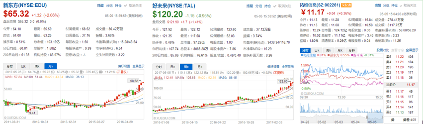 在今年4月25日,新东方市值终于突破100亿美金大关,俞敏洪发内部邮件称“值得给自己倒酒杯庆祝一下,然后把酒杯扔掉”。“好未来”的总市值97.22亿,市盈率高达44.78,股价高达120元,并开始向新东方发起追赶。与这两只“中概股”相比,拓维信息比较低调,作为首家登陆A股市场的上市公司经过过去两年的高速扩张,总市值也高达124.12亿元。