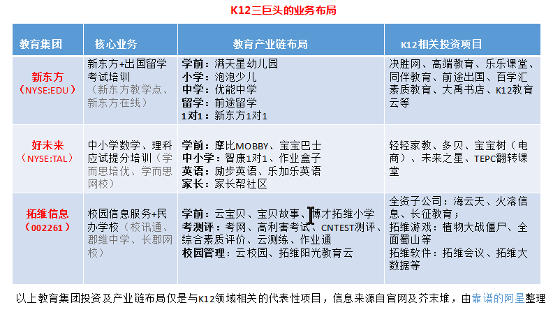 判断教育水平的高低不是看高等教育,而是看基础教育,民国时期钱穆先生去北大当教授前是小学老师,法国大哲柏格森蜚声国际时是中学教师,国内K12培训机构主要以培优为主,满足应试教育中最刚需的部分——升学考试。新东方、好未来、拓维教育是教育市场化浪潮的幸运儿,从商业角度上看,K12教育平台一站式、教育机构的O2O化、教育系统信息化等,有助于提升教学效率促进教学质量与教育公平,但教书育人成才上还需要综合处理校内、校外、课内、课外关系,离不开家长、学校、社会共同努力。