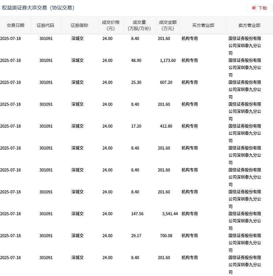 7月18日,深城交大宗交易成交318.53万股,成交额7644.72万元,占当日总成交额的23.18%,成交价24元,较市场收盘价28.93元折价17.04%。