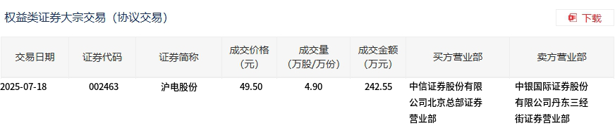 7月18日,沪电股份大宗交易成交4.9万股,成交额242.55万元,占当日总成交额的0.07%,成交价49.5元,较市场收盘价52.1元折价4.99%。