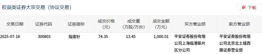 指南针今日大宗交易折价成交13.45万股,成交额1000.01万元