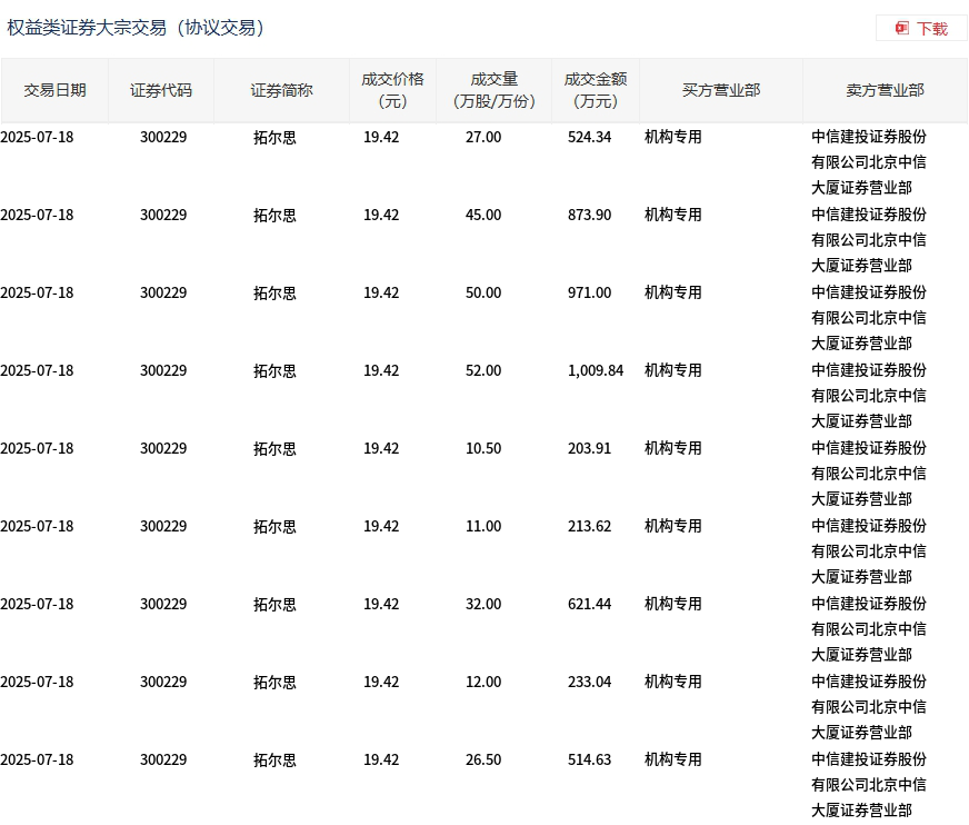 7月18日,拓尔思大宗交易成交266万股,成交额5165.72万元,占当日总成交额的1.81%,成交价19.42元,较市场收盘价22.56元折价13.92%。