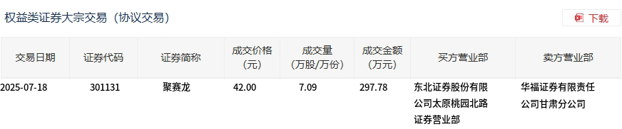 7月18日,聚赛龙大宗交易成交7.09万股,成交额297.78万元,占当日总成交额的2.61%,成交价42元,较市场收盘价46.68元折价10.03%。