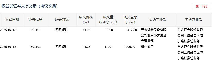 7月18日,明月镜片大宗交易成交15万股,成交额619.2万元,占当日总成交额的3.84%,成交价41.28元,较市场收盘价45.87元折价10.01%。