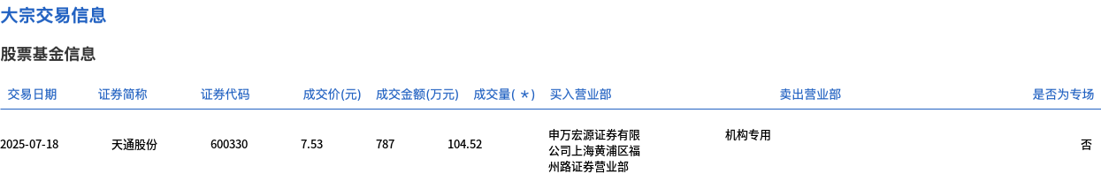 7月18日,天通股份大宗交易成交104.52万股,成交额787万元,占当日总成交额的3.08%,成交价7.53元,较市场收盘价7.53元持平。