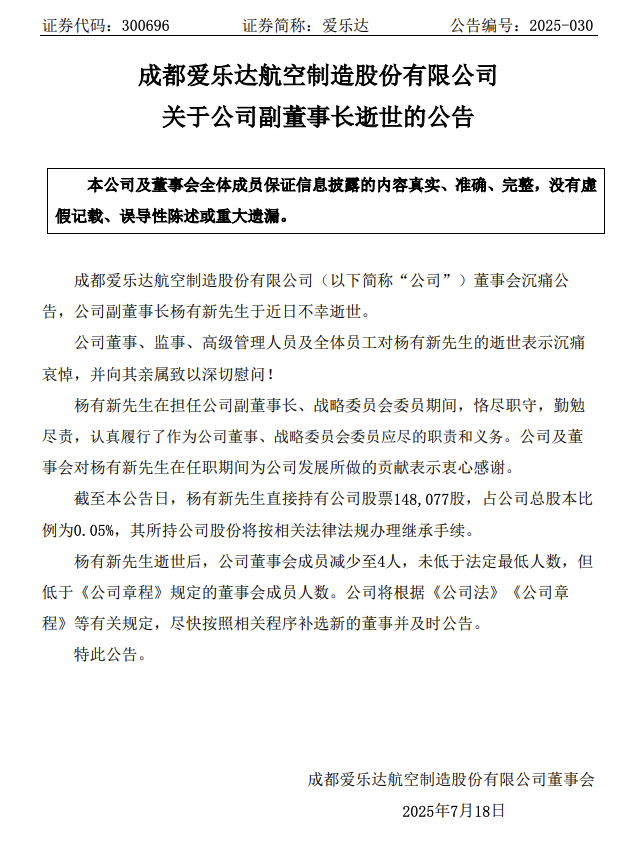 爱乐达7月18日晚间公告,公司董事会沉痛公告,公司副董事长杨有新于近日不幸逝世。截至本公告日,杨有新直接持有公司股票148,077股,占公司总股本比例为0.05%,其所持公司股份将按相关法律法规办理继承手续。