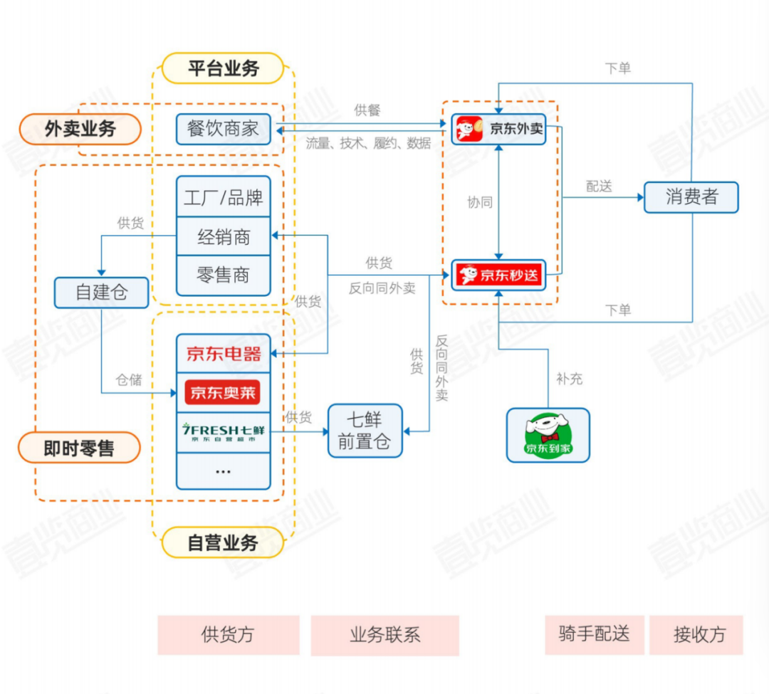 京东模式与美团模式不同的地方有:第一,自营业务的商品来源有一部分来自于自建仓,第二,自营业务中七鲜超市配有前置仓以提升服务范围。京东app可以直接进入外卖和秒送模块,同时还有京东到家作为即时零售业务的重要补充。
