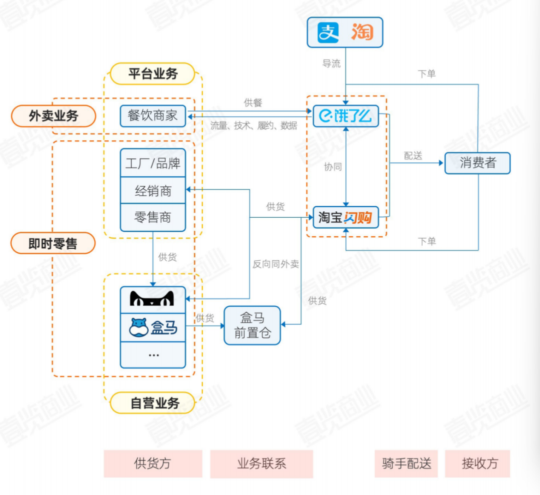 阿里的“外卖+即时零售”模式中,与美团的不同在于自营业务盒马生鲜配有前置仓扩大服务范围。另外,饿了么不仅自身打通了与闪购的联系,支付宝和淘宝首页也可以直接进入闪购和饿了么模块,将即时支付和电商平台的用户导入外卖业务和即时零售。