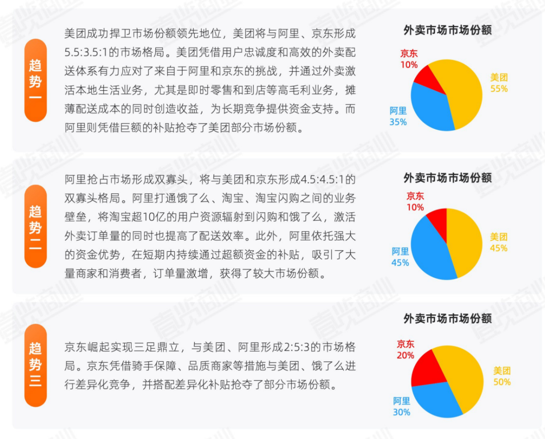 在阿里投入500亿且不继续追加额度的情况下,本轮外卖战或将于双11左右结束,我们对下半年外卖市场格局做出以下三种预测: