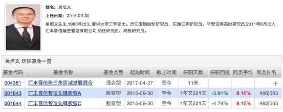 吴培文管理的第一只基金是汇丰晋信智造先锋股票A(001643),始于2015年9月,与他一同任职的还有经验更资深的曹庆,这是基金中常见的“老人带新人”模式,目前曹庆已经离任。数据显示,吴培文的任职回报在-4%左右,低于同类平均水平(8%),低于沪深300指数(6%),但比业绩基准中证装备产业指数收益(-9%)要高一些。