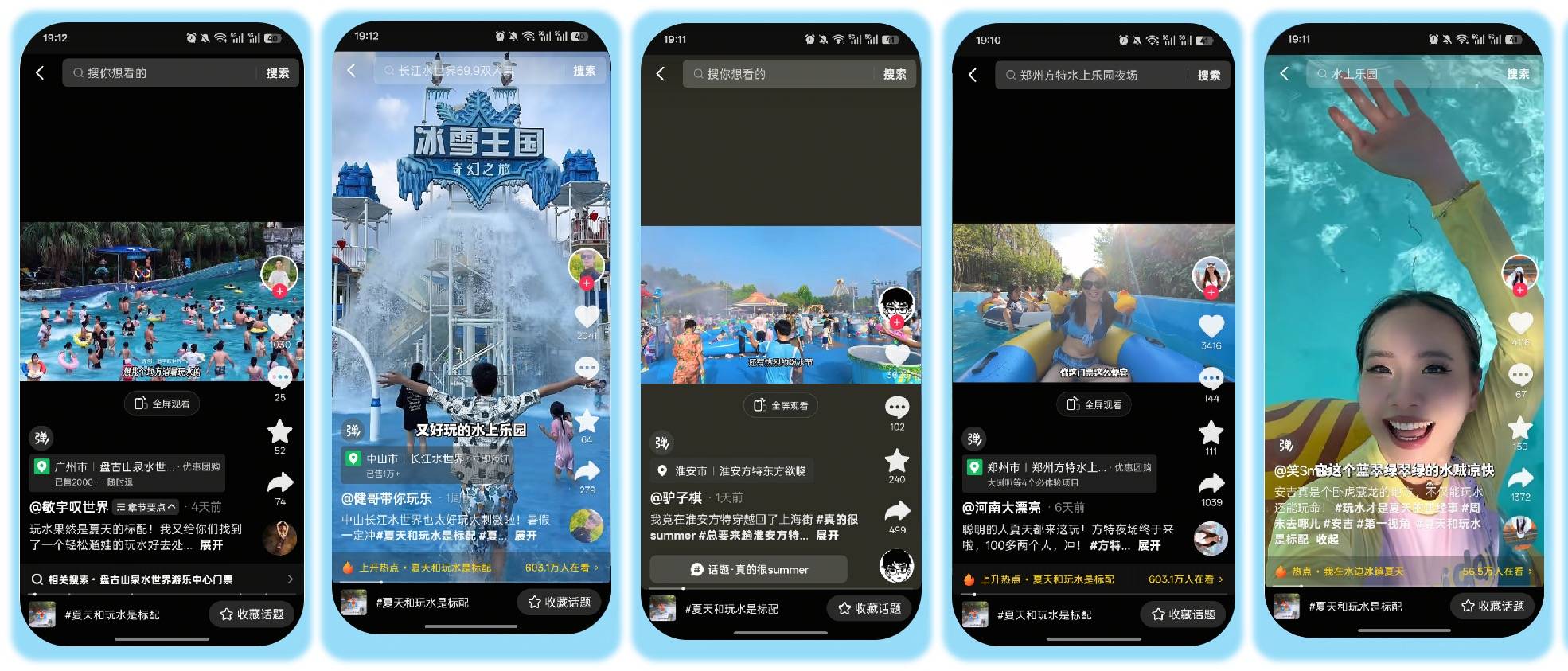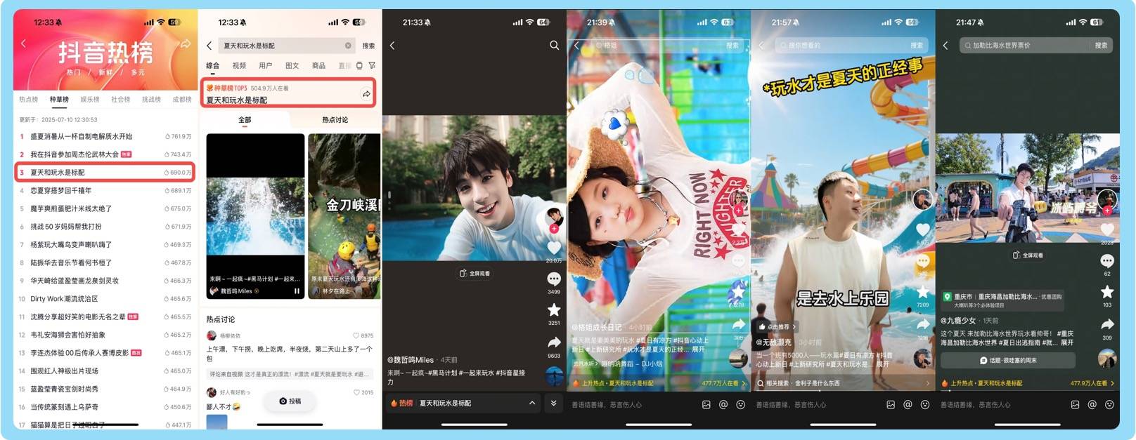 热点上榜带动多个品牌&达人发布夏日新品种草视频,用户进入话题页面,仿佛打开一本全国玩水乐园图鉴:深圳世界之窗、玛雅海滩水公园、中山长江水世界、淮安方特东方欲晓、安吉欢乐风暴水上乐园、郑州方特水上乐园……跟随视频镜头,用户或是 “云体验” 高空滑道,镜头跟着水花一起俯冲,或是围观数百人同时在造浪池里玩耍欢呼、尽情享受凉爽的快乐。大面积的种草共创,不仅让话题内容更丰富,更让 “夏天和玩水是标配” 从有趣的生活提案,变成了全民追捧的消费趋势。