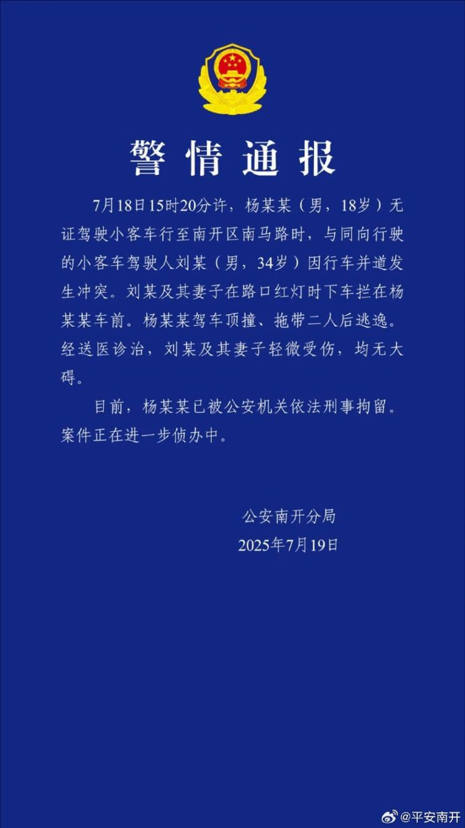 7月19日,天津市公安局南开分局发布警情通报: