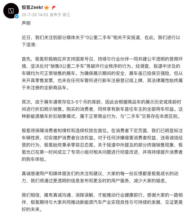 7月20日下午,极氪汽车发布声明称,关注到部分媒体关于“0公里二手车”相关不实报道。经调查,报道中涉及的车辆均为可正常销售的展车。为确保展示期间的安全,展车虽已投保交强险,但从未开具零售发票,也未在任何车管所进行新车注册登记或上牌,其法律属性始终属于未注册的全新商品车。关于报道中所提及的部分终端销售现象,极氪也已在第一时间成立了专项小组对相关问题进行彻查改进。