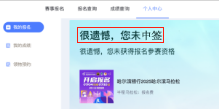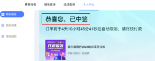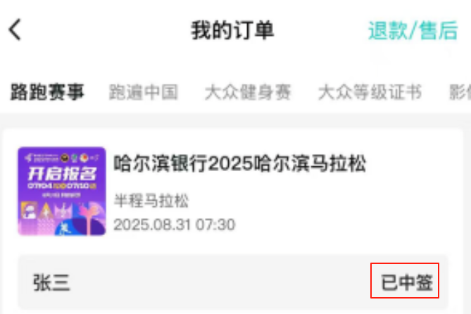 2.在【我的订单-路跑赛事】中找到哈尔滨银行2025哈尔滨马拉松订单,即可看到【已中签】【未中签】【候补中】字样,代表不同的抽签结果。
