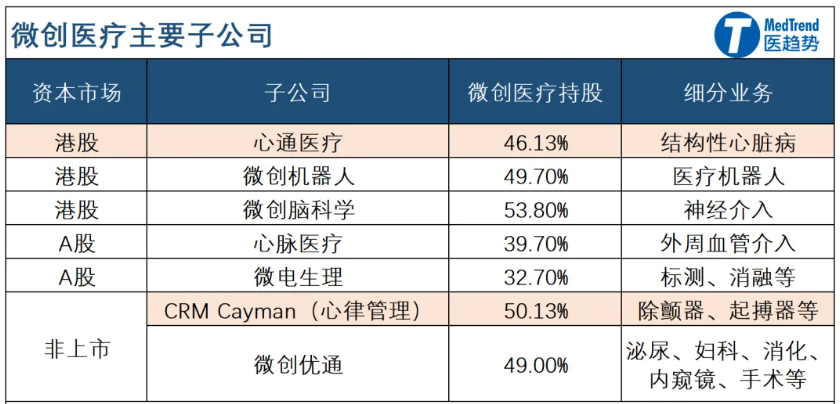 微创医疗集团旗下业务众多,覆盖12个细分赛道(产业集群),拥有50多家子公司,(截至2024年底)主要包括:
