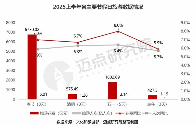2025上半年,国内文旅市场复苏进程持续推进,居民旅游消费信心稳步恢复,旅游已回归大众生活成常态化选项。从春节、清明、五一和端午4个节假日旅游数据观测:出游人次增长稳健、消费复苏活力凸显;且整体收入同比高于人次同比,反映游客在旅游消费中更愿意为优质产品、服务买单,“花钱买体验”消费升级态势明显。