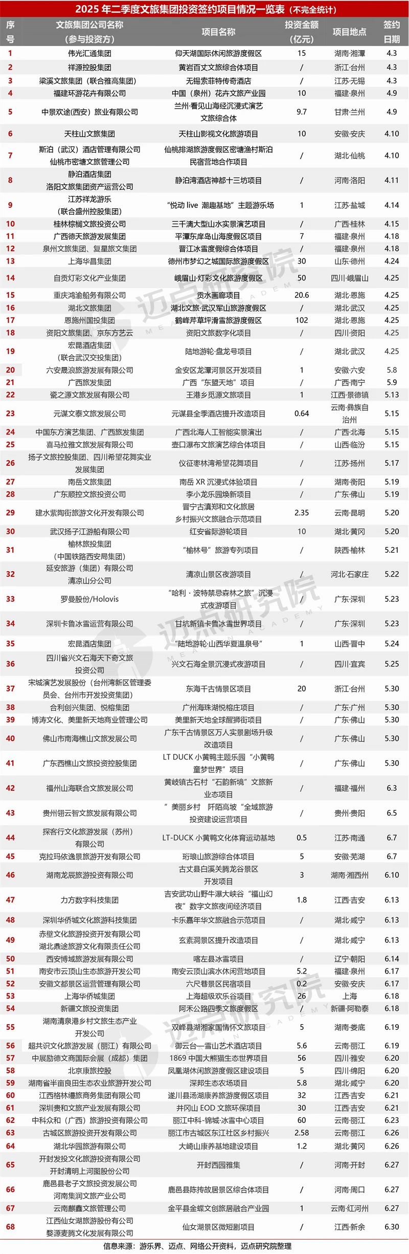 投资主体构成及性质:投资主体多元化,包括国资系(如天柱山文旅集团、湖北文旅集团、新疆文旅投等)、央企(如中国东方演艺集团、深圳华侨城文化旅游科技集团等)、大型民营企业(如祥源控股、宋城演艺等)、中小型民营企业(如中景欢途旅业有限公司、江苏祥龙游乐)等,共同发力、彰显市场信心。