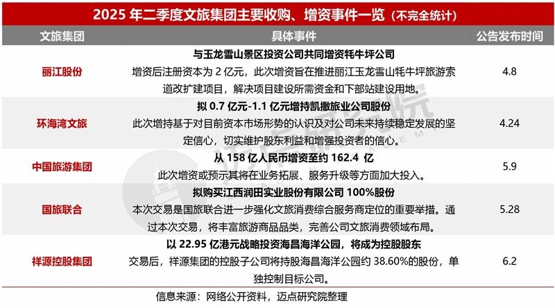 2025年二季度文旅集团增资、收购方面动作频出:增资类,丽江股份为推进景区项目建设、中国旅游集团为战略布局、环海湾文旅为稳定发展,分别开展增资;收购类,国旅联合拟收购润田实业以完善业务,祥源控股集团战略投资海昌海洋公园利于其扩大文旅版图、提高核心能力、拓展资源渠道等。