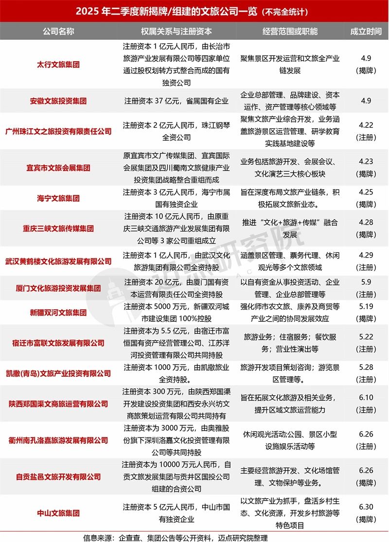 2025年二季度,新组建的文旅集团呈现出国资主导、民营市场化运营发展、跨界融合趋势增强的特点,反映出文旅产业正朝着资源整合、多元发展、创新融合的方向迈进。