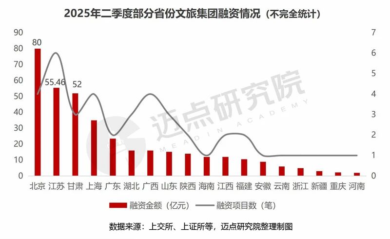 据迈点研究院不完全统计,2025Q2文旅集团融资项目(仅指已发行和通过)42项,项目数量同比2024Q2下降约36%,涉及29个文旅集团,融资金额总计369.03亿元,同比下降2.9%(2024Q2为380.04亿元)。