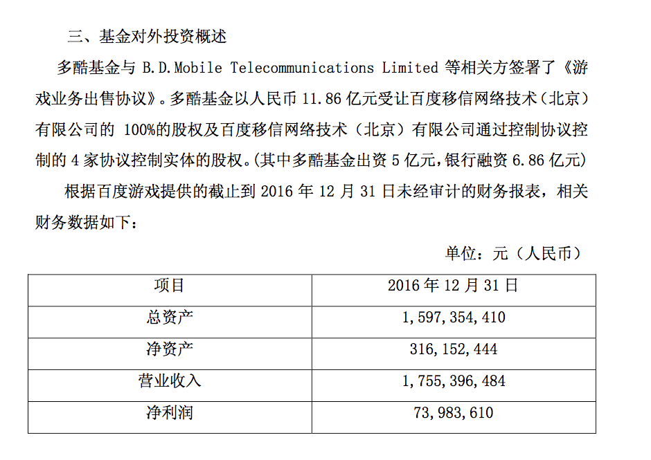 早前披露的公告显示,多酷基金以11.86亿元受让百度移信网络技术(北京)有限公司的100%的股权,及其通过控制协议控制的4家协议控制实体的股权,即百度游戏。
