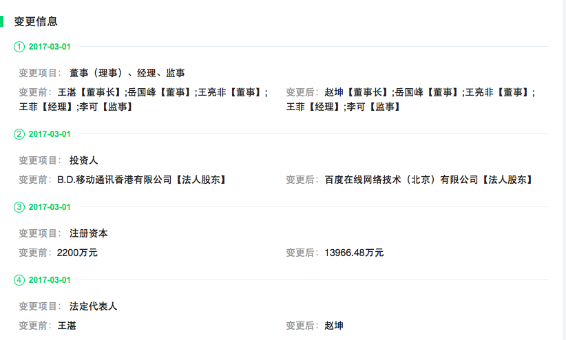 此外,记者在企业查询宝上发现,今年3月1日,百度移信网络技术(北京)有限公司在法定代表人、董事、注册资本等方面已经完成了一轮变更。