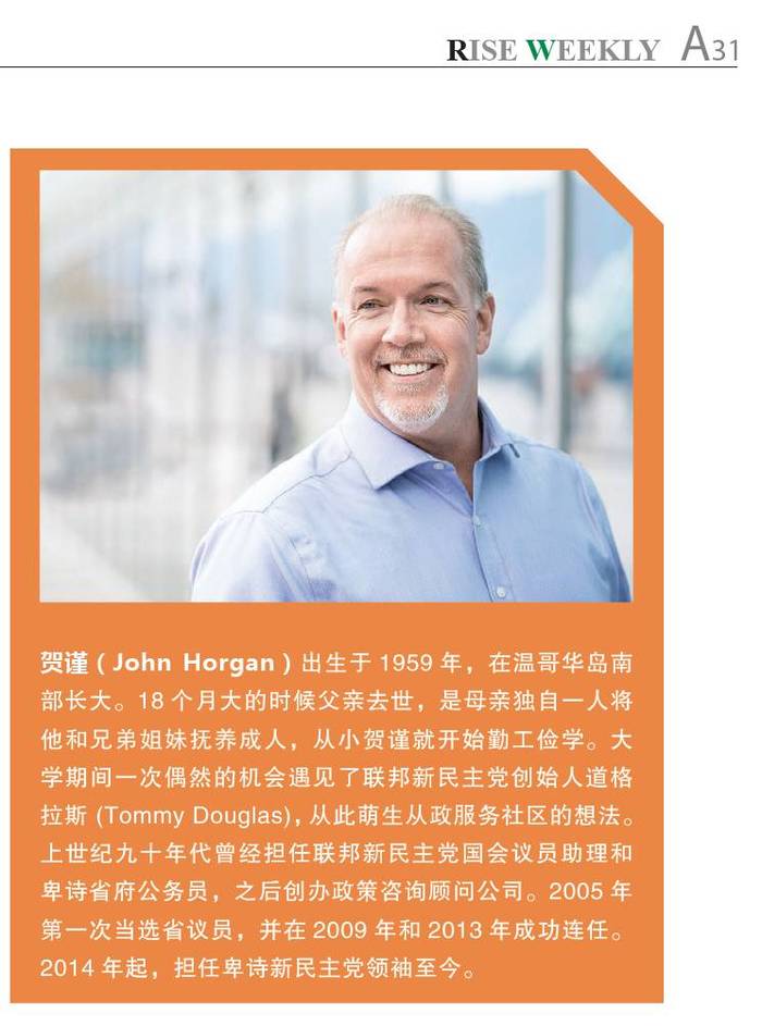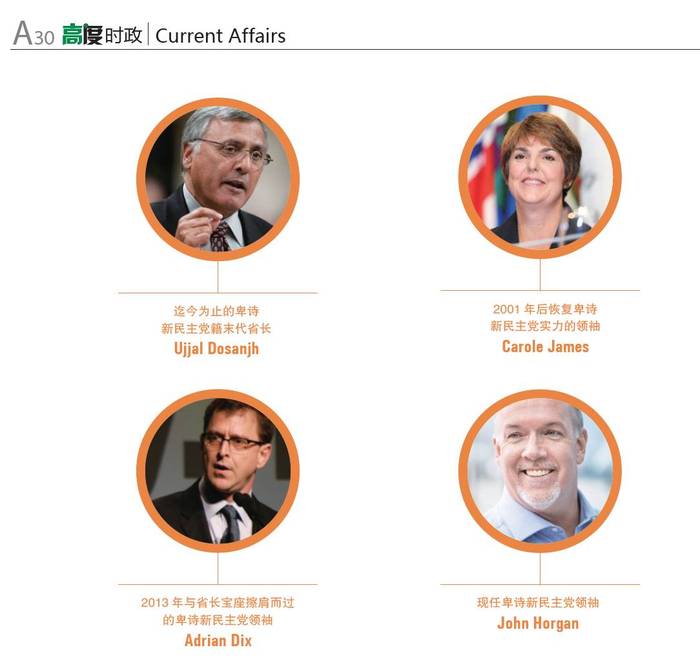 2014年5月,省议员John Horgan接任领袖。在今年省选中,John Horgan主打民生牌,提出建立让省民共享的经济前景,实行碳税税务优惠政策,增加对医疗和教育领域投入,改革医保系统,加大兴建可负担住房,投资大温公交基建,推行十加元一天的儿童日托和将最低时薪逐步调整到15加元等,希望夺回失去十六年的执政权。
