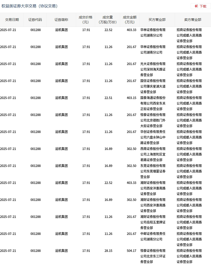 7月21日,运机集团大宗交易成交225.19万股,成交额4033.17万元,占当日总成交额的19.38%,成交价17.91元,较市场收盘价20.95元折价14.51%。
