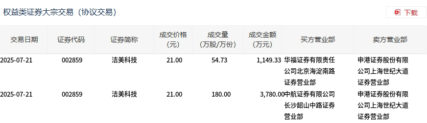 7月21日,洁美科技大宗交易成交234.73万股,成交额4929.33万元,占当日总成交额的26.51%,成交价21元,较市场收盘价21.01元折价0.05%。
