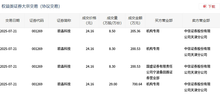 7月21日,欧晶科技大宗交易成交54.1万股,成交额1307.06万元,占当日总成交额的8.17%,成交价24.16元,较市场收盘价27.12元折价10.91%。
