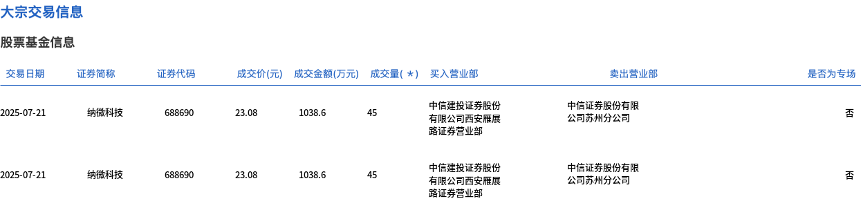 7月21日,纳微科技大宗交易成交90万股,成交额2077.2万元,占当日总成交额的10.61%,成交价23.08元,较市场收盘价25.45元折价9.31%。
