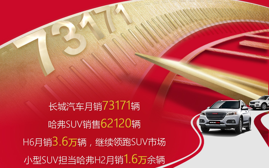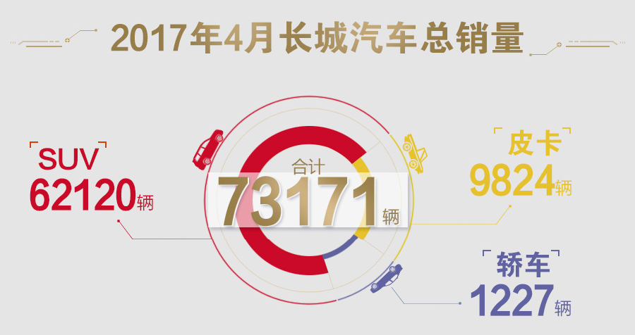 刚看到长城汽车4月销量快报:共计销售汽车73171辆,其中哈弗SUV销售62120辆,皮卡销售9824辆,轿车销售1227辆。截至4月底,长城汽车本年度累计销售327330辆,其中哈弗SUV销售283777辆。
