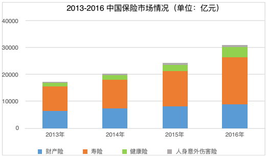 2014年保险行业总规模超过2万亿,2016年轻松突破3万亿。总保费规模进一步增长,然而在保险市场整体发展的背后,各险种的情况有所不同。其中作为中国健康类保险最大市场份额的寿险的增速近两年依然强劲,而以社保补充险为代表的健康险在增长率上略猛于其他险种。
