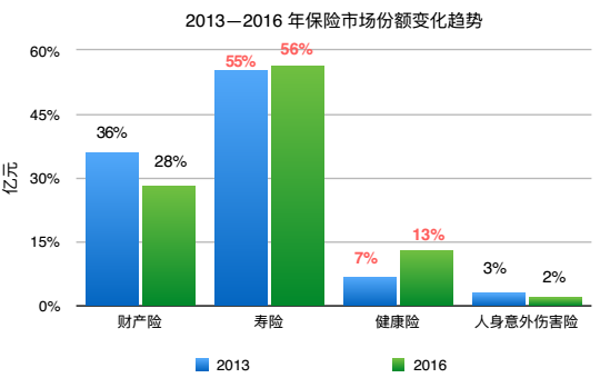 2016年,中国健康险市场规模为:寿险1万6千亿,健康险4千亿。这两类为主的健康领域保险从整个市场份额的62%上升至接近70%。