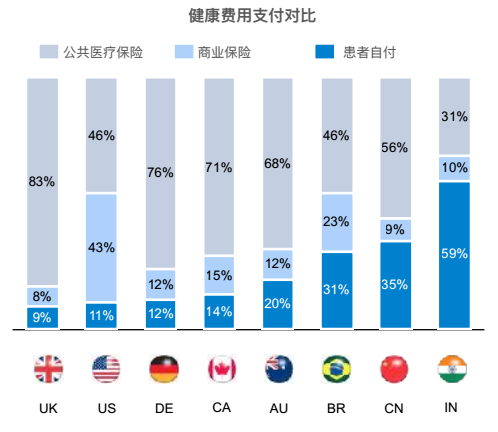 中国和印度的自付比例过高,同为人口巨大的发展中国家,走欧洲高税收、高福利的社会保障路径似乎并不现实,相对来说,大力发展商业保险,更符合我们的国情。