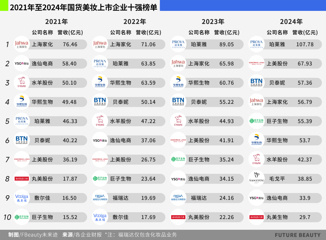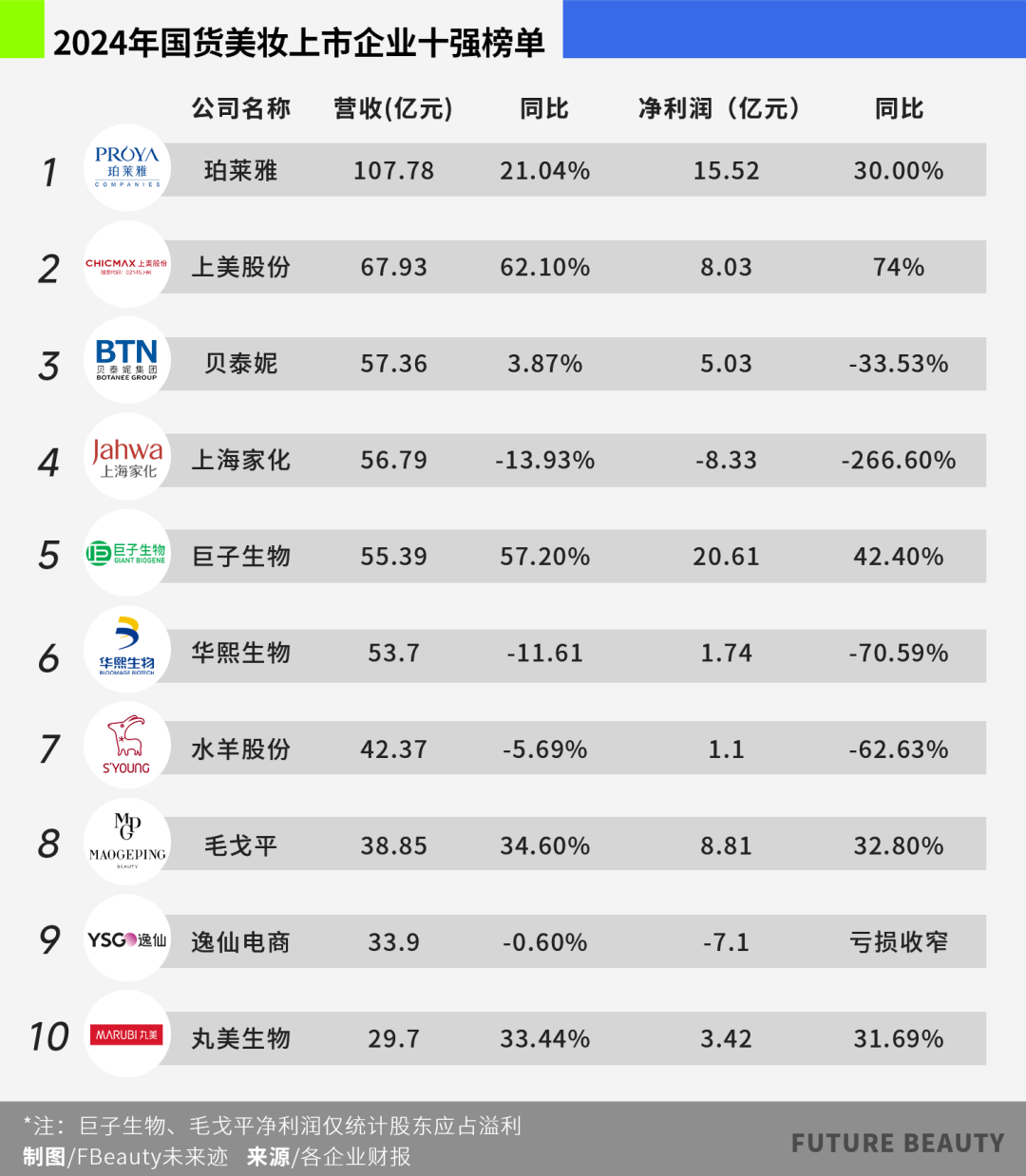 但是十强的变动多数为位次的变化,“新面孔”出现的频次并不多,而2024年年底成功上市的毛戈平,也成为该年十强榜单中的唯一“新面孔”。可见,企业上市的成功与否,直接影响了行业头部竞争格局。