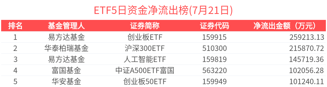 2025年7月21日共263只ETF基金获资金净流入,458只ETF基金净流出。净流入金额超1亿元的有34只,科创债ETF博时(551000.SH)、港股通互联网ETF(159792.SZ)、香港证券ETF(513090.SH)、基建50ETF(516970.SH)、港股通非银ETF(513750.SH)资金显著流入,分别净流入21.83亿元、9.65亿元、6.25亿元、5.92亿元、5.77亿元(净申购份额*单位净值)。