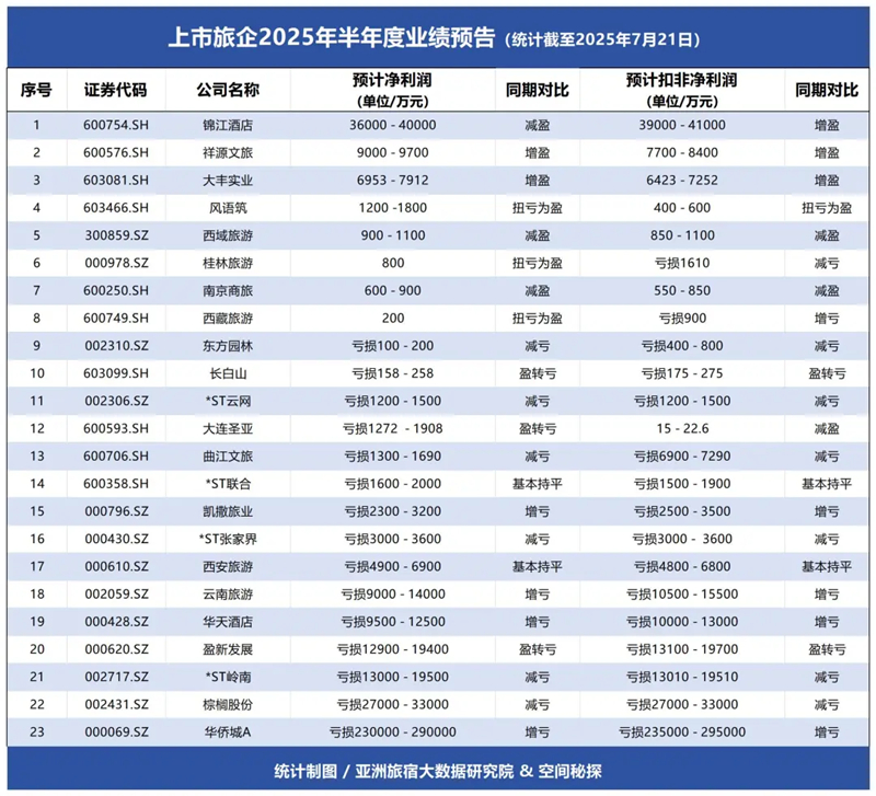 近日,多家上市旅企发布2025年半年度业绩预告。空间秘探梳理目前(统计时间截至7月21日)已披露的二十三家旅企报告发现,其中十五家企业都深陷亏损泥沼,合计亏损约40亿。
