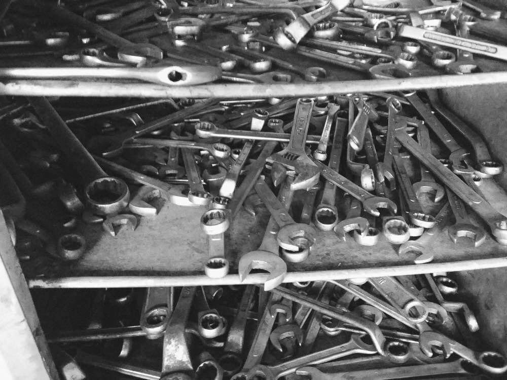 车间里的旧升降台总是一副随时会塌下来的样子,唯一干净的角落里,是一只唯一上着锁的铁甲工具柜。晚上,铁柜由一只叫将军的大狼狗看着。铁柜里极具金属质感的工具排列端正,像是消过毒的手术器械。我最喜欢的时刻就是看着王师傅准确地取出一件件扳手或套筒,心里涌起崇拜,这远比坐在摆着点心咖啡,隔着大玻璃的4S店享受。