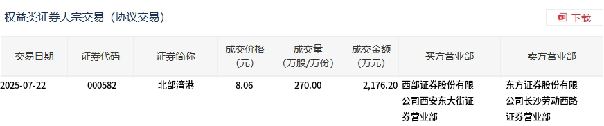 7月22日,北部湾港大宗交易成交270万股,成交额2176.2万元,占当日总成交额的5.76%,成交价8.06元,较市场收盘价8.4元折价4.05%。