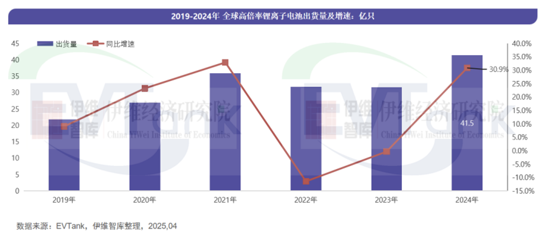 近日,研究机构EVTank联合伊维经济研究院共同发布了《中国高倍率电池行业发展白皮书(2025年)》。白皮书数据显示,2024年全球高倍率电池出货量41.5亿只,同比增长30.9%。EVTank指出,高倍率电池主要应用于电动工具、手持吸尘器、无人机、eVTOL、高速电摩、汽车启停、航模、储能调频、混动汽车、UPS等对大电流放电有特殊要求的场景。