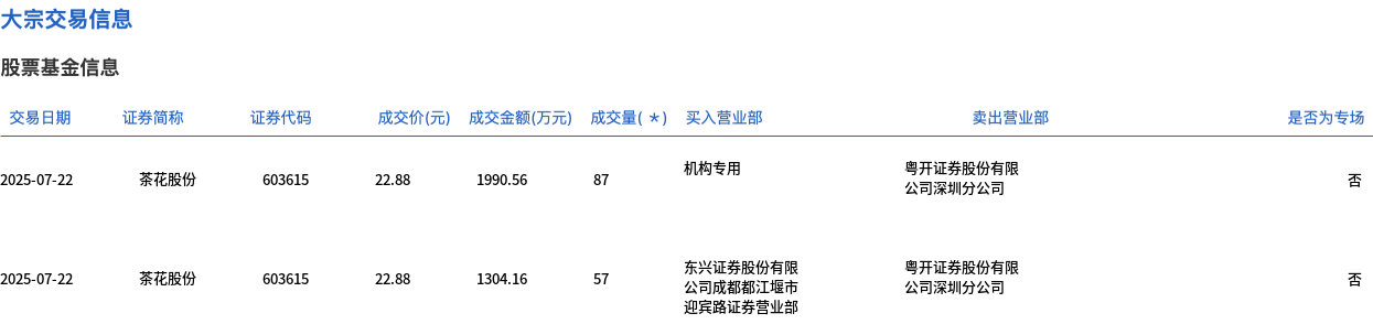 7月22日,茶花股份大宗交易成交144万股,成交额3294.72万元,占当日总成交额的20.42%,成交价22.88元,较市场收盘价24.08元折价4.98%。