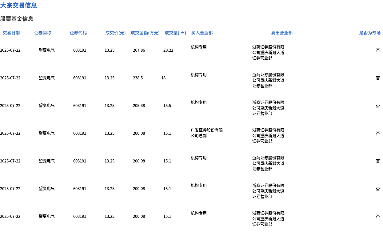 7月22日,望变电气大宗交易成交129.22万股,成交额1712.14万元,占当日总成交额的3.61%,成交价13.25元,较市场收盘价15.33元折价13.57%。