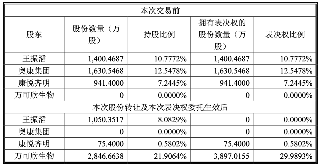 公告显示,王振滔及其一致行动人奥康集团有限公司(以下简称“奥康集团”)、持股5%以上股东济南康悦齐明投资合伙企业(有限合伙)(以下简称“康悦齐明”)合计向万可欣生物转让2846.66万股,占公司总股本的21.91%,每股作价65.0266元,总交易金额18.51亿元。其中奥康集团转让12.55%股权,王振滔个人转让2.69%,康悦齐明转让6.66%。