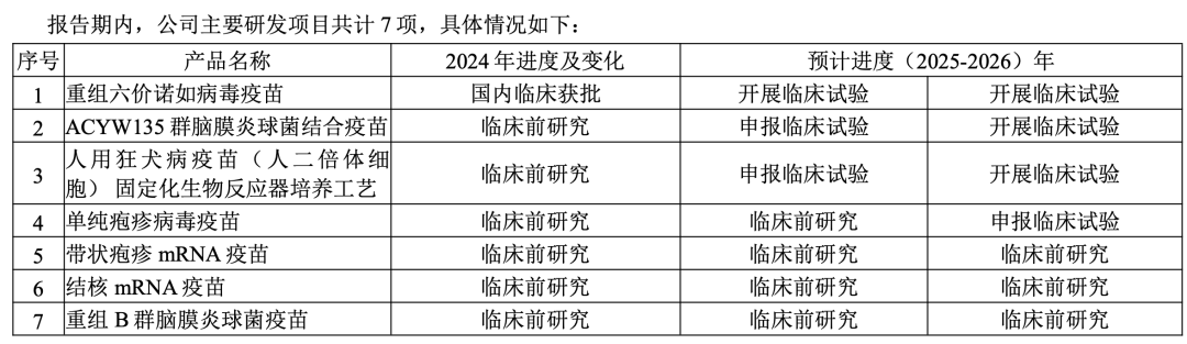 近年来,康华生物在研发方面投入了大量资金,以推动新产品的研发和上市。2024年,公司主要研发项目共计7项,包括重组六价诺如病毒疫苗、ACYW135 群脑膜炎球菌结合疫苗、单纯疱疹病毒疫苗、带状疱疹mRNA疫苗、结核mRNA疫苗等。