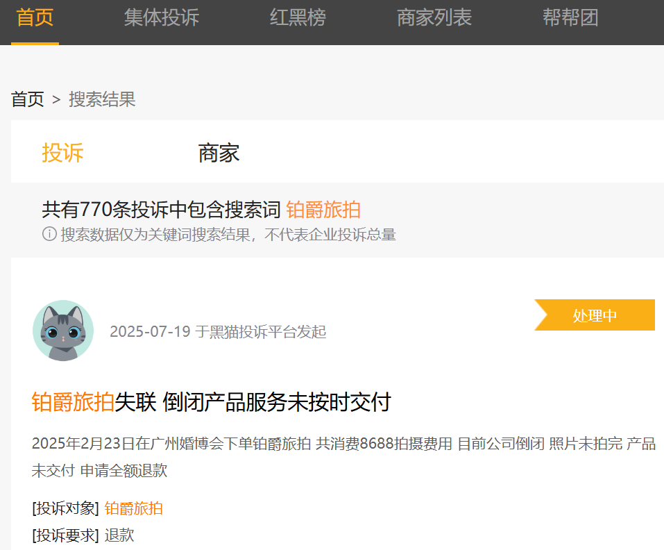 仅在黑猫投诉平台,涉及铂爵旅拍的投诉,就有770条,“拍照丑”、“修图敷衍”等,是投诉高频词。